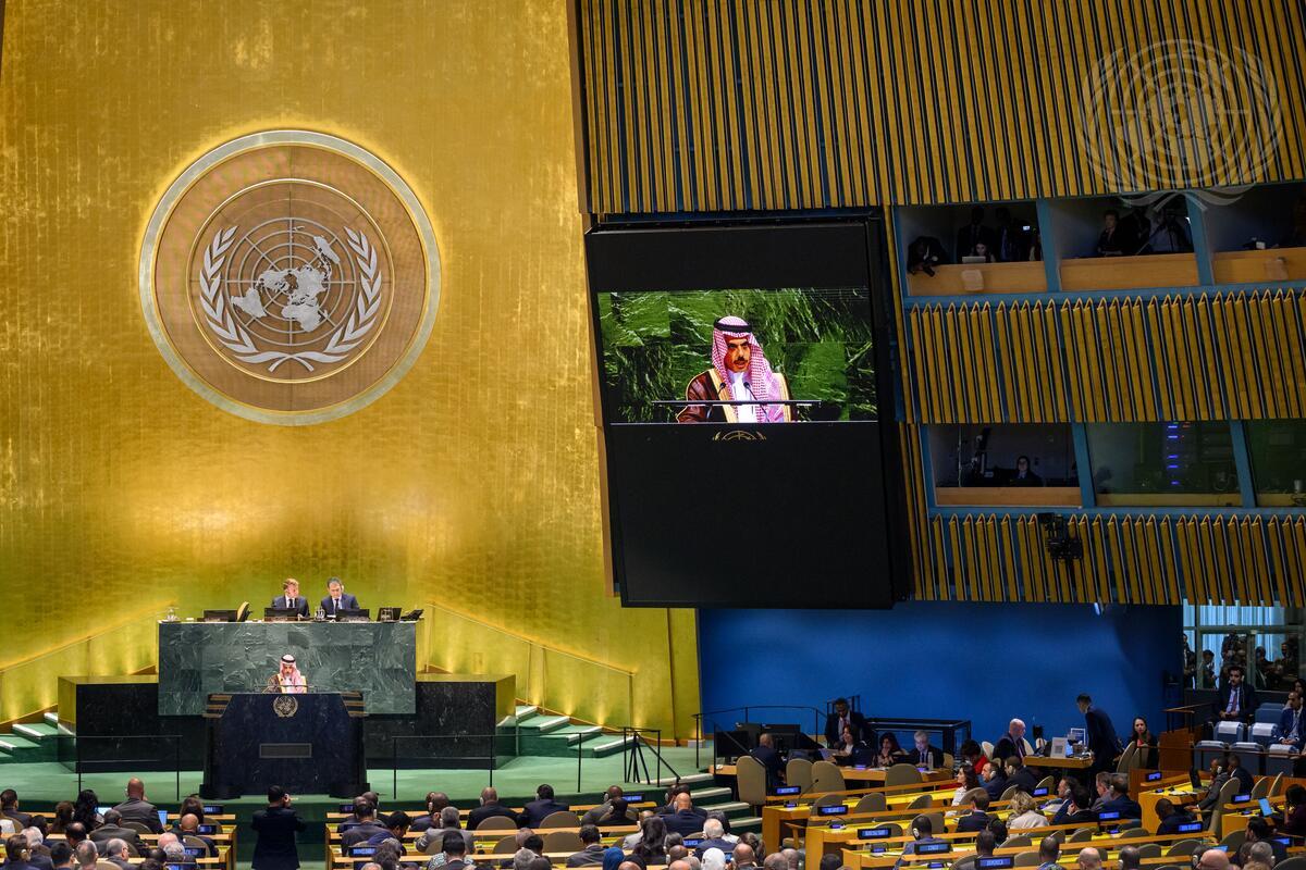 Prince Faisal bin Farhan Al Saud (at podium and on screen), Minister for Foreign Affairs of the Kingdom of Saudi Arabia and Co-Chair of the High-Level International Conference for the Peaceful Settlement of the Question of Palestine and the Implementation of the Two-State Solution, addresses the Conference (resumed). On the dais are Emmanuel Macron (left), President of the Republic of France and Co-Chair of the Conference and Movses Abelian, Under-Secretary-General for General Assembly and Conference Management (DGACM).