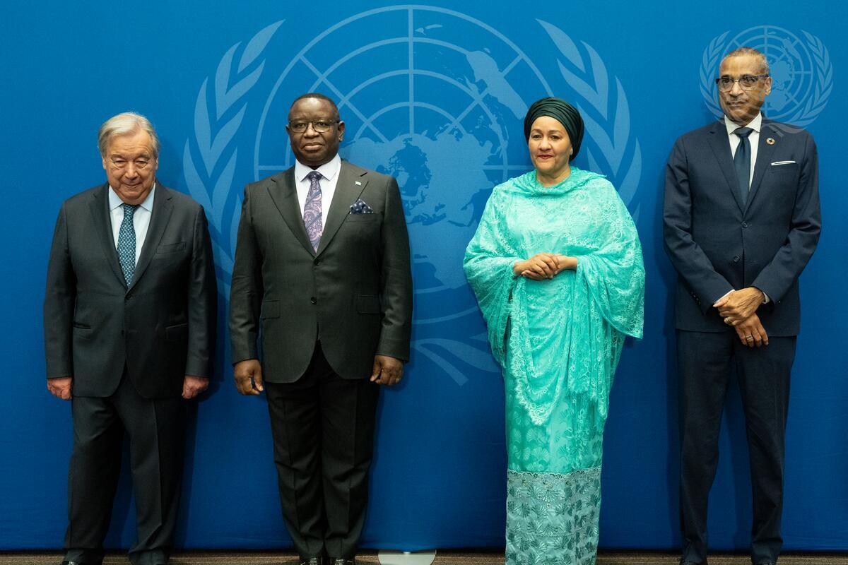 Secretary-General António Guterres (left), Deputy Secretary-General Amina Mohammed (second right), and Courtenay Rattray (right), Chef de Cabinet of the Secretary-General, greet global leaders on the second day of the 80th General Assembly Debate.