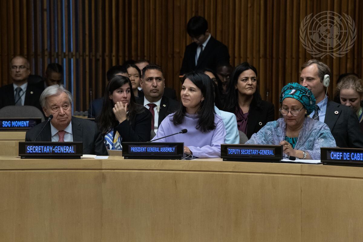 Secretary-General António Guterres (left) and Annalena Baerbock (centre), President of the eightieth session of the United Nations General Assembly, and Deputy Secretary-General Amina Mohammed (right) attend the SDG Moment 2025: Keeping the Promise.