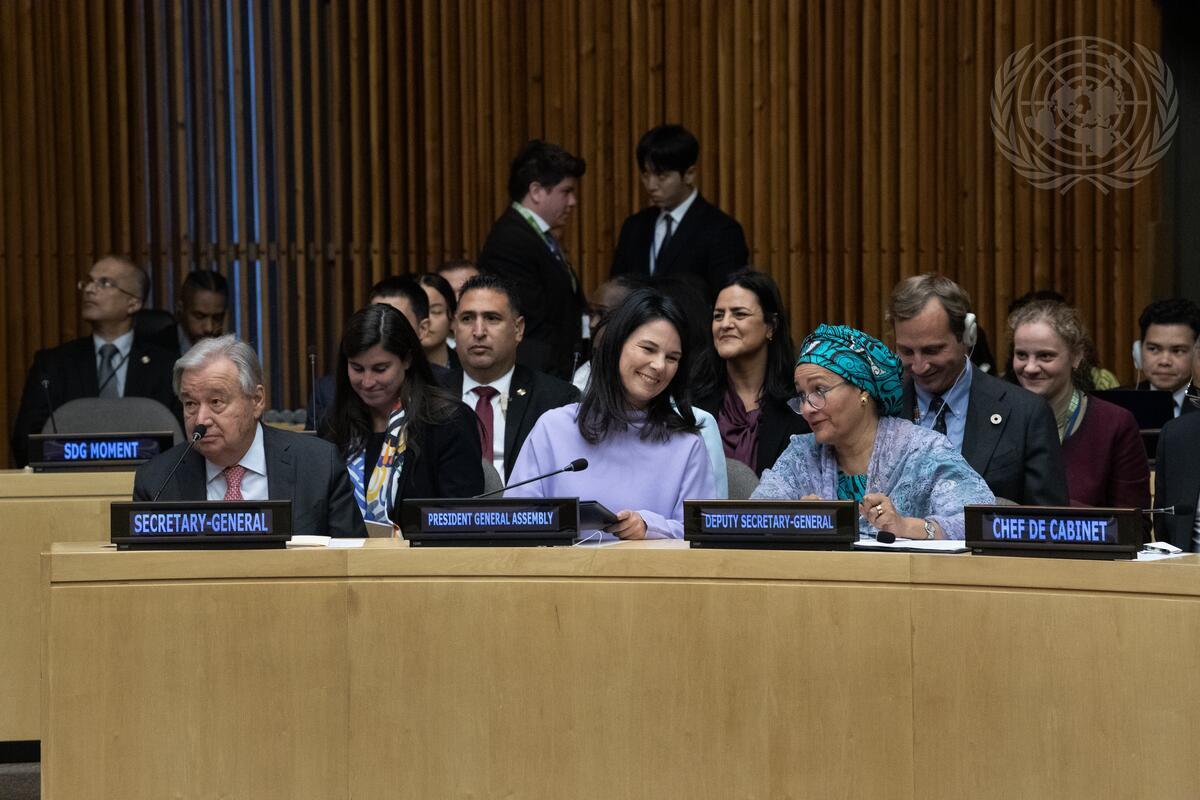 Secretary-General António Guterres (left) and Annalena Baerbock (centre), President of the eightieth session of the United Nations General Assembly, and Deputy Secretary-General Amina Mohammed (right) attend the SDG Moment 2025: Keeping the Promise.