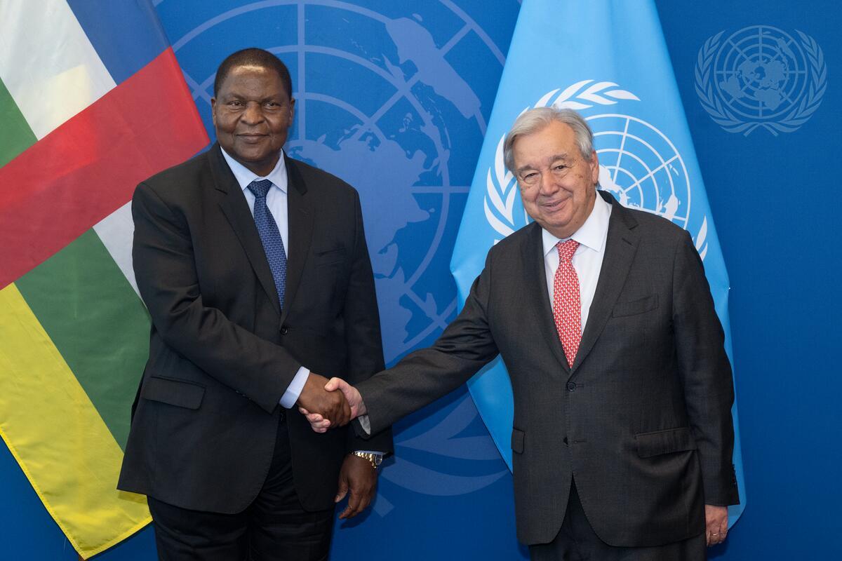 Secretary-General António Guterres (right) meets with Faustin Archange Touadéra, President of Central African Republic.