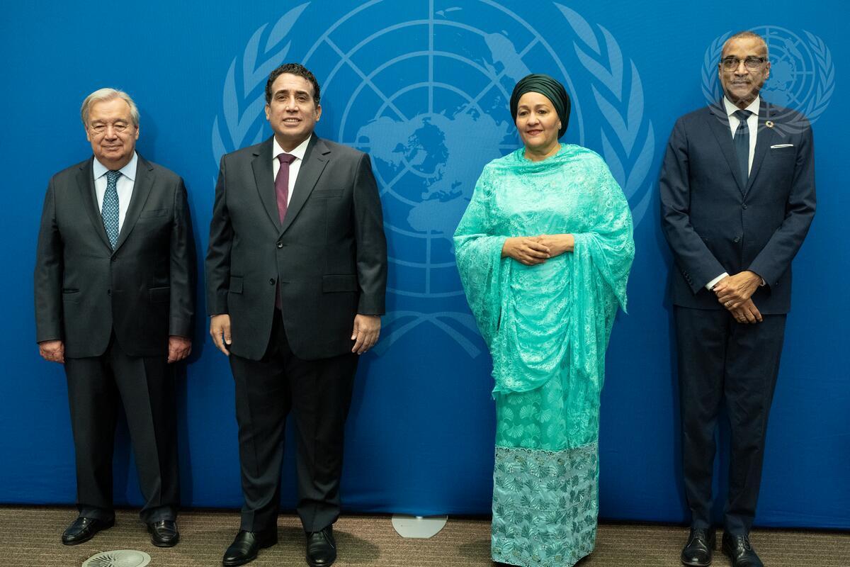 Secretary-General António Guterres (left), Deputy Secretary-General Amina Mohammed (second right), and Courtenay Rattray (right), Chef de Cabinet of the Secretary-General, greet global leaders on the second day of the 80th General Assembly Debate.