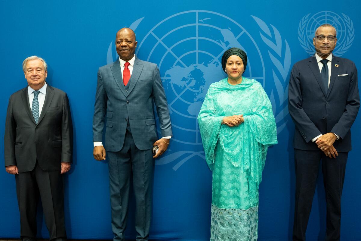 Secretary-General António Guterres (left), Deputy Secretary-General Amina Mohammed (second right), and Courtenay Rattray (right), Chef de Cabinet of the Secretary-General, greet global leaders on the second day of the 80th General Assembly Debate.