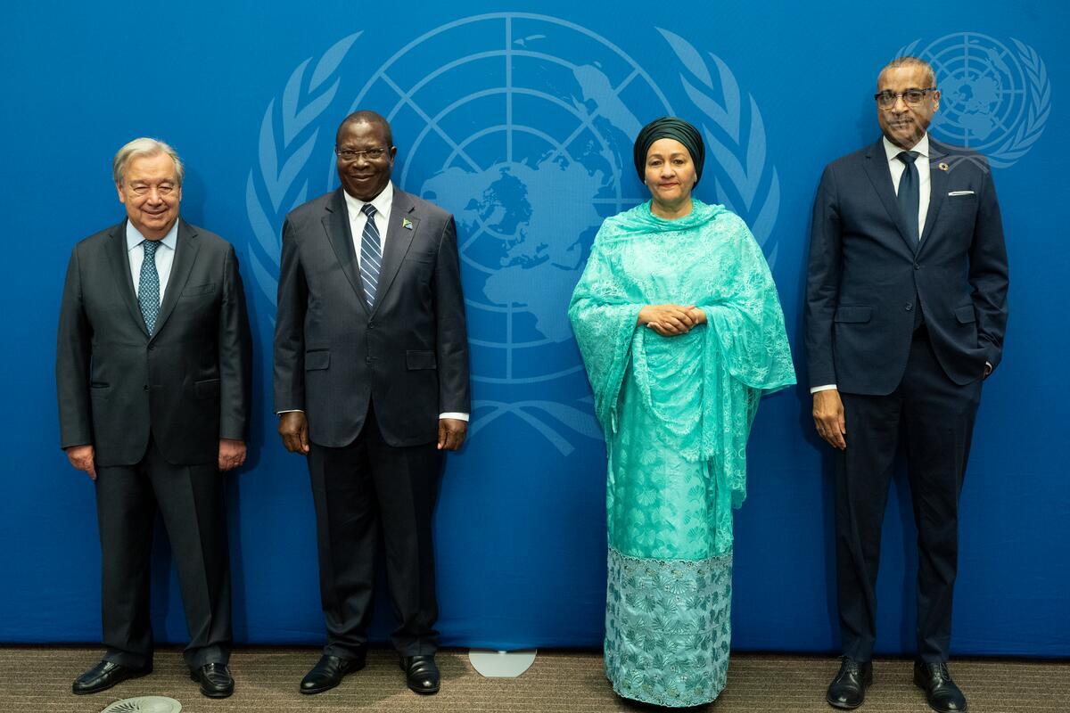 Secretary-General António Guterres (left), Deputy Secretary-General Amina Mohammed (second right), and Courtenay Rattray (right), Chef de Cabinet of the Secretary-General, greet global leaders on the second day of the 80th General Assembly Debate.