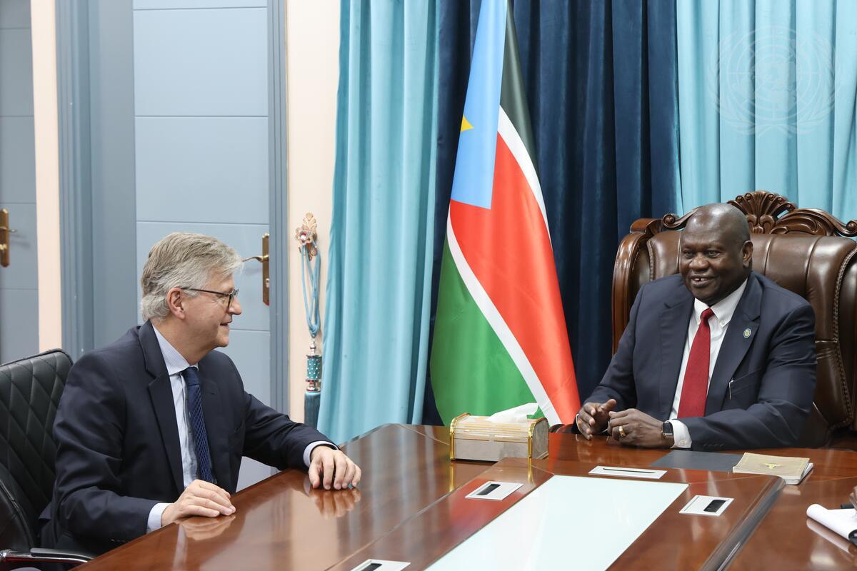 Jean-Pierre Lacroix (left), Under-Secretary-General for Peace Operations, meets with Riek Machar, First Vice President of the Republic of South Sudan.