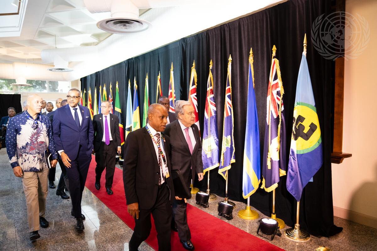 Secretary-General António Guterres (right) arrives to attend the opening ceremony of the 48th Regular Meeting of the Conference of the Heads of Government of the Caribbean Community (CARICOM).