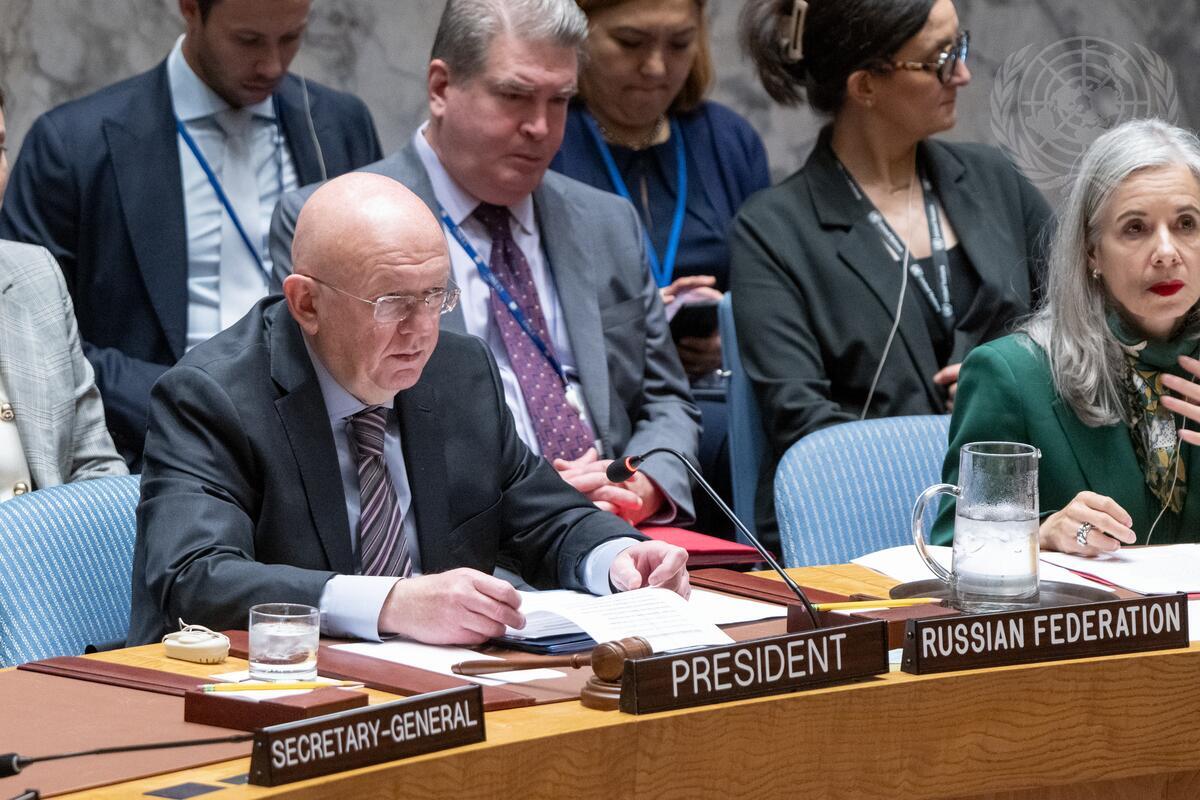Vassily Nebenzia, Permanent Representative of the Russian Federation and President of the Security Council for the month of October, chairs the Security Council meeting on the situation in the Middle East, including the Palestinian question.