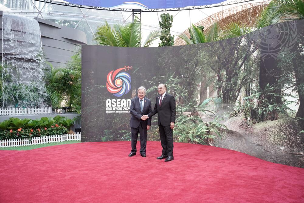 Secretary-General António Guterres (left) is greeted by Anwar Ibrahim, Prime Minister of Malaysia, at the opening of the 47th ASEAN Summit at the Kuala Lumpur Convention Centre.