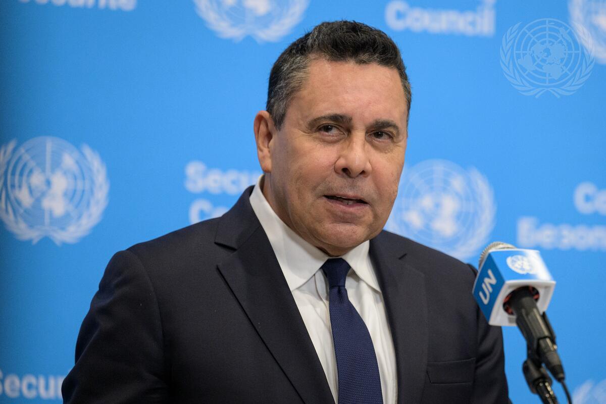 Samuel Moncada, Permanent Representative of the Bolivarian Republic of Venezuela to the United Nations, briefs reporters at UN Headquarters.