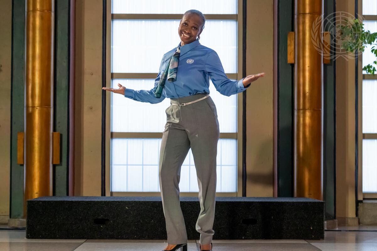 UN Staff Member Aida Sow Njanja Fassu shows the collection during the launch of the new United Nations Tour Guide uniforms.