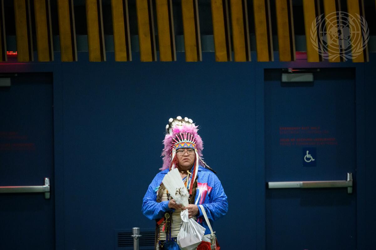 A participant attends the opening of the 24th Session of the Permanent Forum on Indigenous Issues (21 April – 2 May). The theme of the 24th Session is "Implementing the United Nations Declaration on the Rights of Indigenous Peoples within United Nations Member States and the United Nations system, including identifying good practices and addressing challenges”.