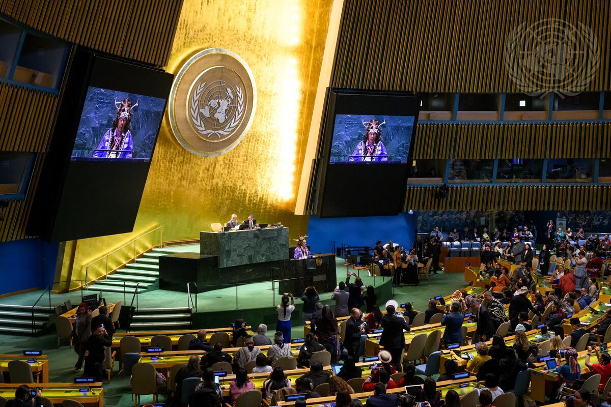 Chief Tadodaho Sidney Hill of the Onondaga Nation (at podium and on screens) performs a ceremonial welcome during the opening of the 24th Session of the Permanent Forum on Indigenous Issues (21 April – 2 May). The theme of the 24th Session is "Implementing the United Nations Declaration on the Rights of Indigenous Peoples within United Nations Member States and the United Nations system, including identifying good practices and addressing challenges”.