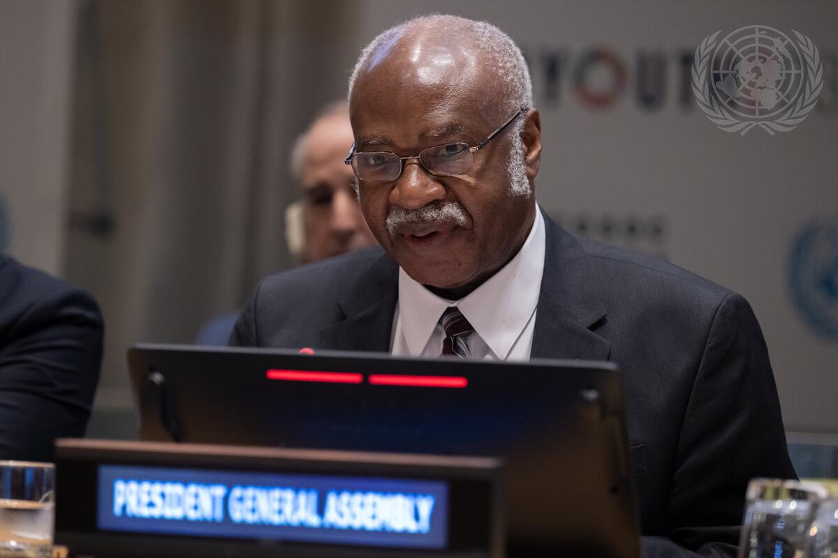 Philemon Yang, President of the seventy-ninth session of the United Nations General Assembly, speaks during the Economic and Social Council Youth Forum (ECOSOC) on the theme "Youth at the Forefront: Leveraging Science and Social Inclusion for Sustainable Development".