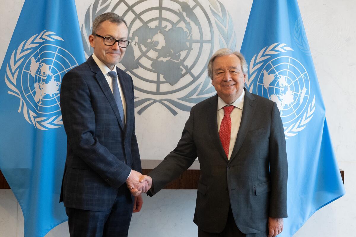 Secretary-General António Guterres (right), meets with Jürg Lauber, President of the United Nations Human Rights Council.