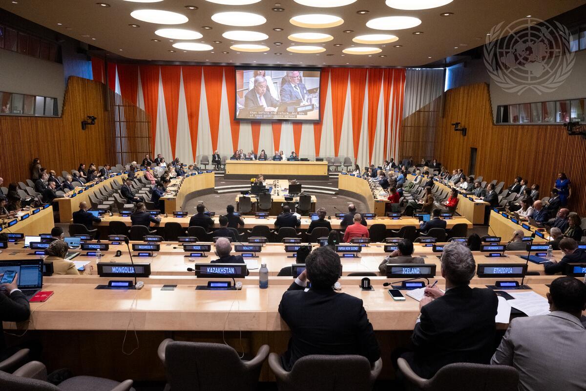 A wide view of the Interactive Dialogue of the Economic and Social Council on Operational Activities for Development Segment. On the screen is Secretary-General António Guterres.