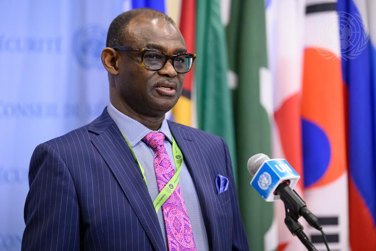 Al-Harith Idriss Al-Harith Mohamed, Permanent Representative of the Sudan to the United Nations, briefs reporters at UN Headquarters.