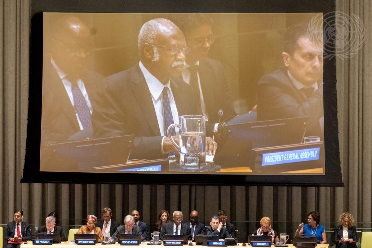 Philemon Yang (centre at dais and on screen), President of the seventy-ninth session of the United Nations General Assembly, attends the informal meeting of the General Assembly plenary that heard a briefing by Secretary-General António Guterres (not pictured) on the UN80 Initiative.