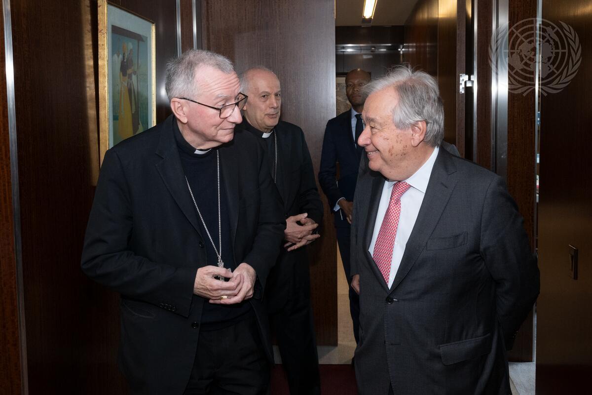Secretary-General António Guterres (right) meets with Cardinal Pietro Parolin (left), Secretary of State of the Holy See.