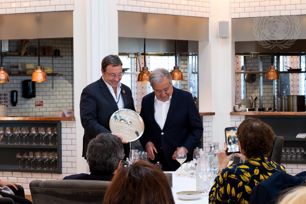 Secretary-General António Guterres (standing right) presents a farewell gift to Achim Steiner (left), Administrator of the United Nations Development Programme (UNDP), in recognition of his service, during the Chief Executives Board meeting in Helsingør, Denmark.