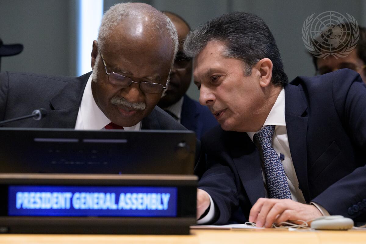 Philemon Yang (left), President of the seventy-ninth session of the United Nations General Assembly, speaks with Movses Abelian, UN Under-Secretary-General for General Assembly and Conference Management, during the informal meeting of the General Assembly plenary that heard a briefing by Secretary-General António Guterres (not pictured) on the UN80 Initiative.