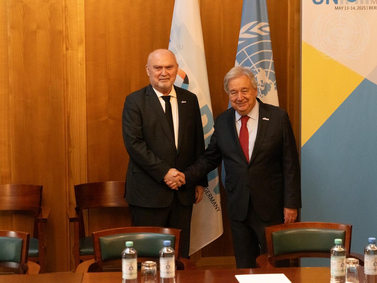 Secretary-General António Guterres (right) meets with Feridun H. Sinirlioğlu, Secretary-General of the Organization for Security and Co-operation in Europe (OSCE), on the side of the UN Peacekeeping Ministerial 2025 in Berlin.