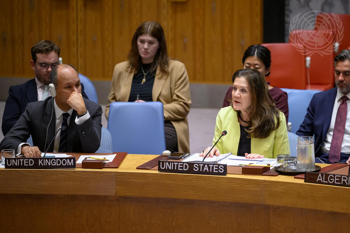 Dorothy Shea (right at table), Chargé d’affaires, a.i of the United States of America to the United Nations, addresses the Security Council meeting on the situation in the Middle East (Yemen). At left is James Kariuki, Deputy Permanent Representative of the United Kingdom to the United Nations.