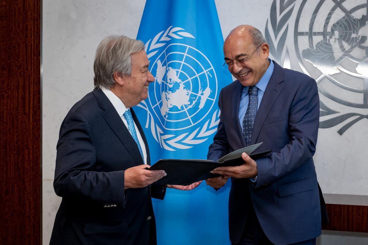 Mohamed Edrees (right), Permanent Observer of the African Union, presents his credentials credentials to UN Secretary-General António Guterres.