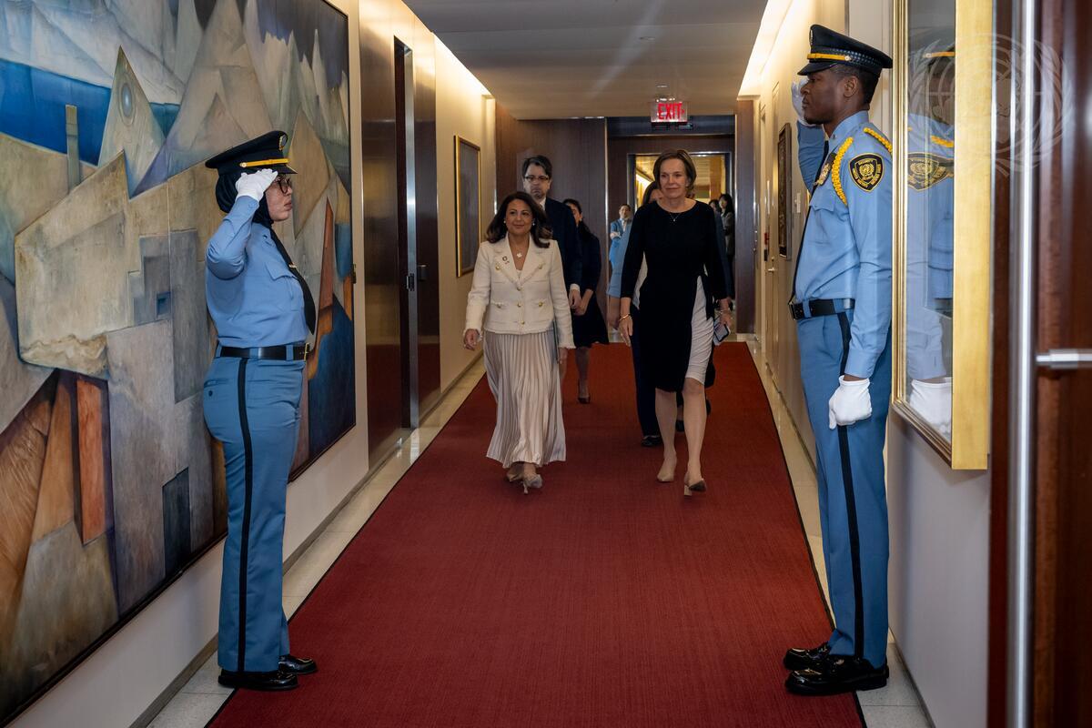 Natasha Meli Daudey (centre left), Permanent Representative of the Republic of Malta to the United Nations, arrives to present her credentials credentials to UN Secretary-General António Guterres (not pictured).