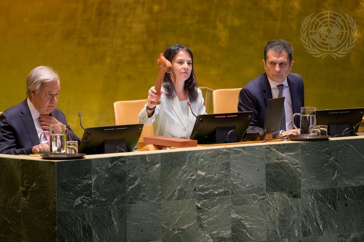 Caption Description Annalena Baerbock (centre), President of the eightieth session of the United Nations General Assembly, opens the 1st plenary meeting of the eightieth session of the United Nations General Assembly. At left is Secretary-General António Guterres and at right is Movses Abelian, Under-Secretary-General for General Assembly and Conference Management (DGACM).