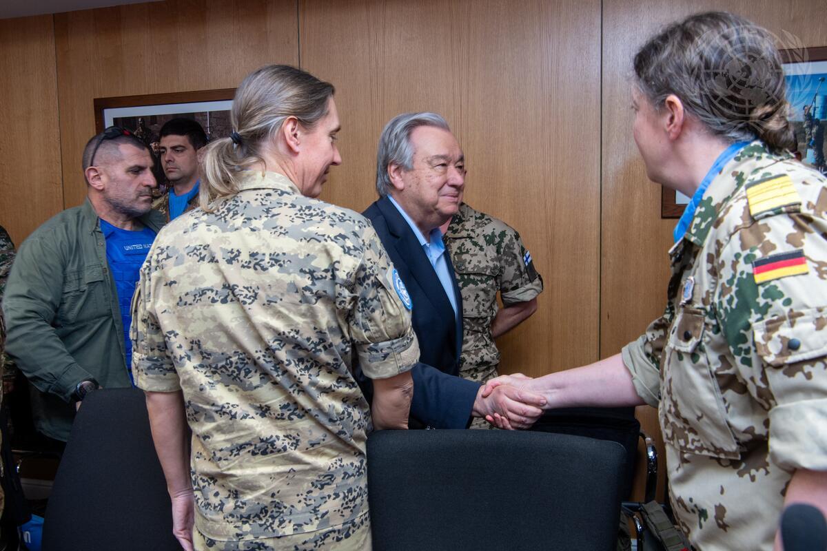 Secretary-General António Guterres (second right) meets with peacekeepers as he visits the headquarters of the United Nations Interim Force in Lebanon (UNIFIL) in Naqoura, Lebanon.
