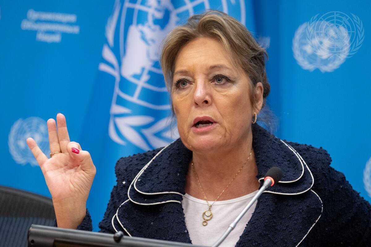 Yasmine Sherif, Executive Director of Education Cannot Wait (ECW), briefs reporters on ECW's latest Global Estimates Report, on the occasion of the International Day of Education (24 January).