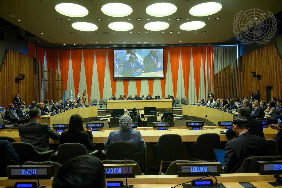 Adonia Ayebare (on screen), Permanent Representative of the Republic of Uganda to the United Nations and Outgoing Chair of the Group of 77, addresses the ceremonial meeting to mark the formal handover of the Chairmanship of the Group of 77 from the Republic of Uganda to the Republic of Iraq.