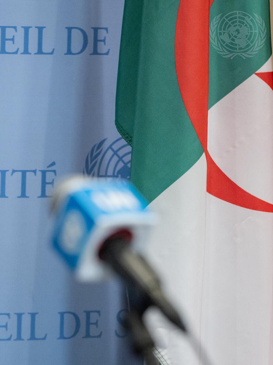 A detail of Algeria’s flag is seen during a reading of Security Council press elements on the situation in Lebanon following the country's elections by Amar Bendjama, Permanent Representative of Algeria to the United Nations and President of the Security Council for the month of January 2025.