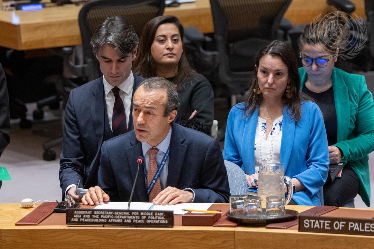 Khaled Khiari, Assistant Secretary-General for Middle East, Asia and the Pacific, Departments of Political and Peacebuilding Affairs and Peace Operations, briefs the Security Council meeting on the situation in the Middle East, including the Palestinian question.