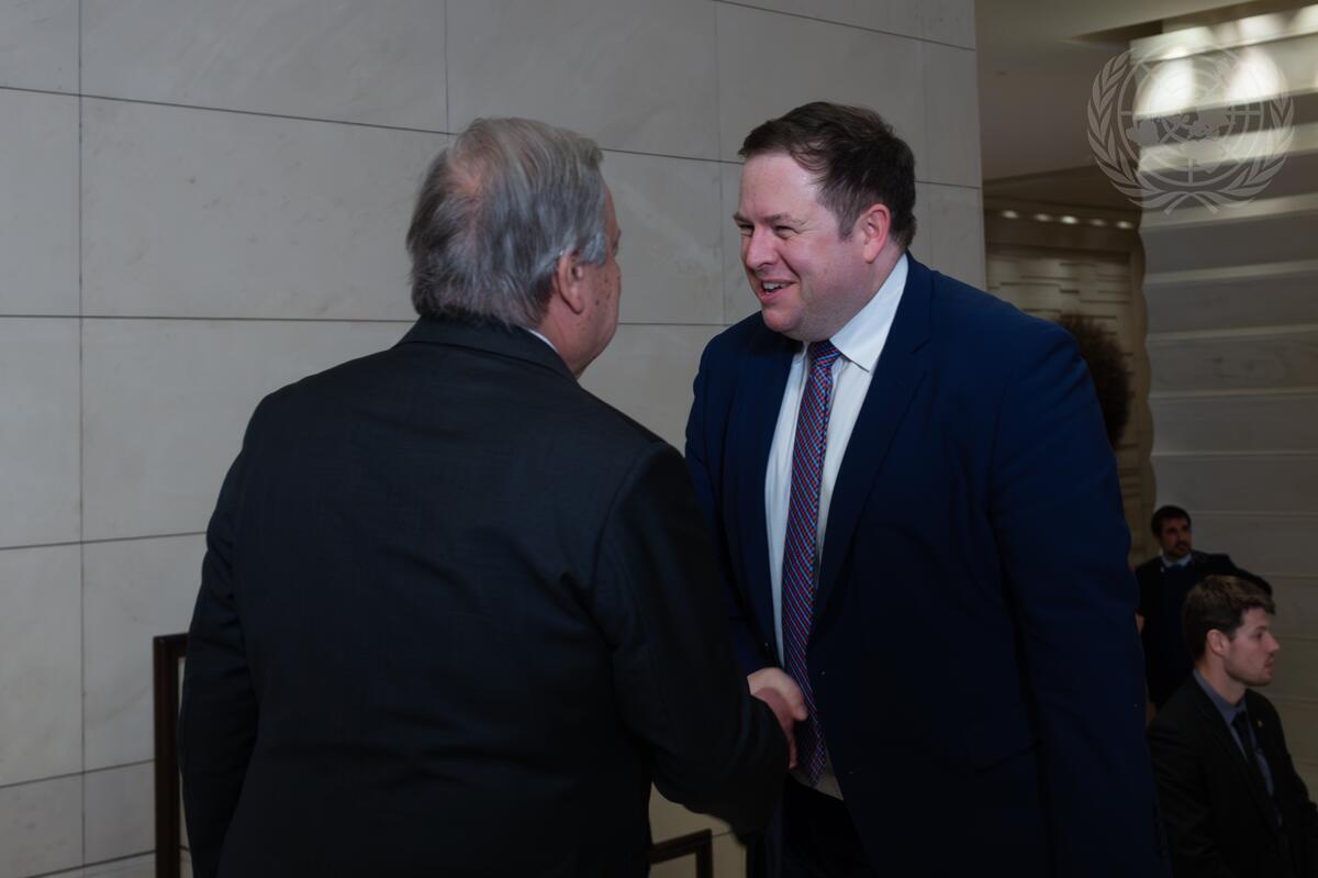 UN Secretary-General António Guterres (left) greets Stephen Doughty, Minister of State for Europe, North America, and Overseas Territories for the United Kingdom, prior to the opening of the Informal Meeting on Cyprus at Geneva.