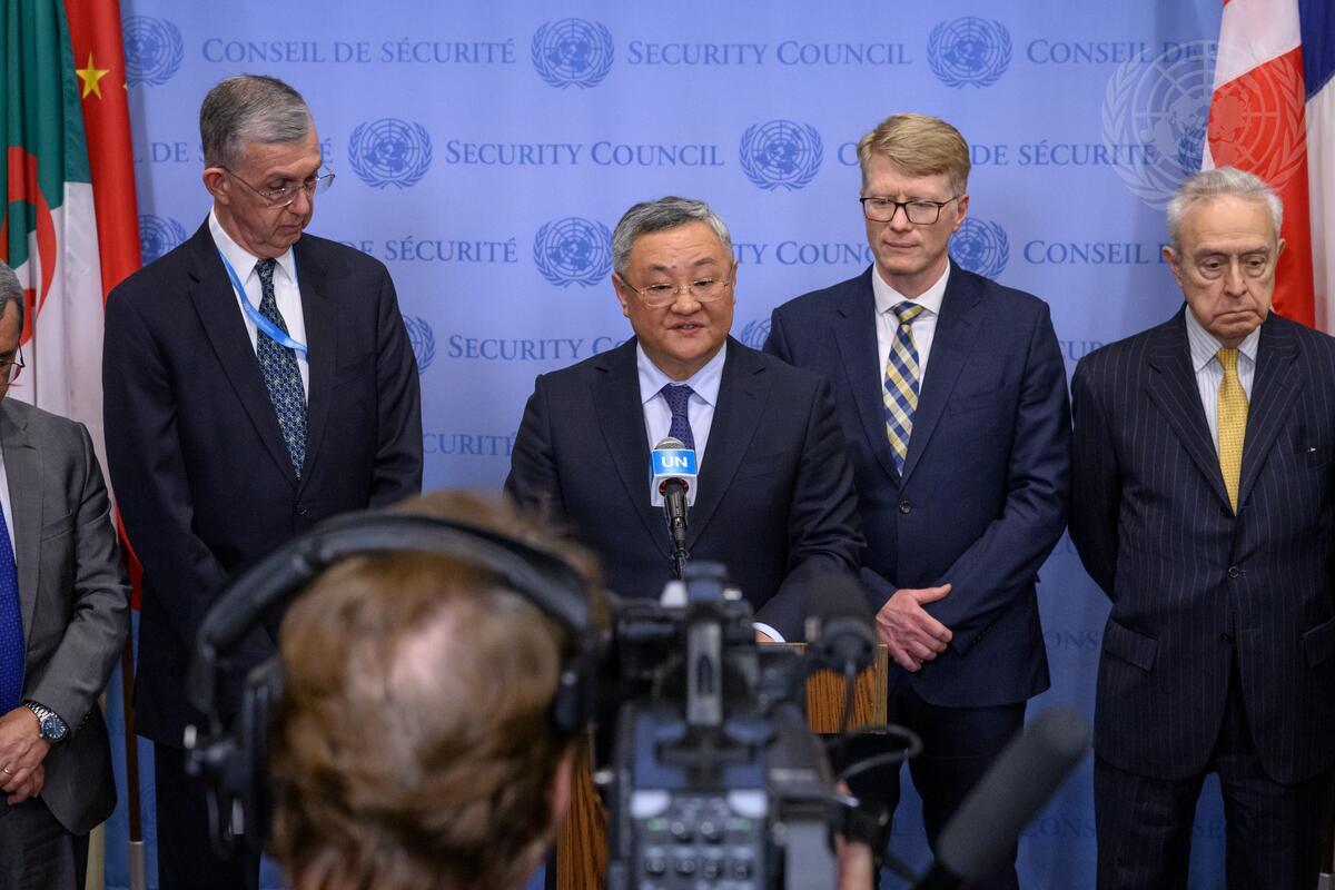 Fu Cong, Permanent Representative of the People’s Republic of China to the United Nations, briefs reporters together with representatives from the Group of Friends for Peace on the Ukraine Crisis. At left is Sérgio França Danese, Permanent Representative of Brazil to the United Nations.