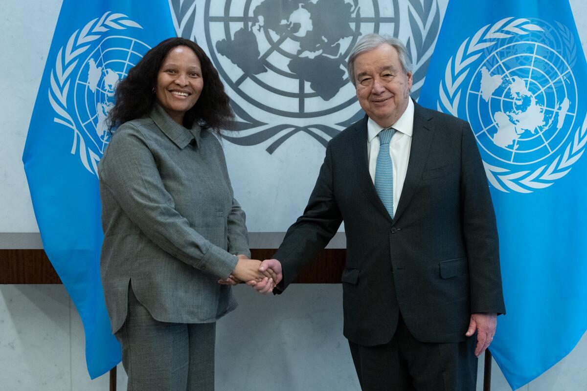Gladys Mokhawa (left), Permanent Representative of Botswana to the United Nations, pays a farewell call on Secretary-General António Guterres.