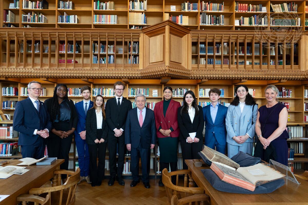 UN Secretary-General António Guterres (centre) meets with a delegation of students at the University of Leuven library.