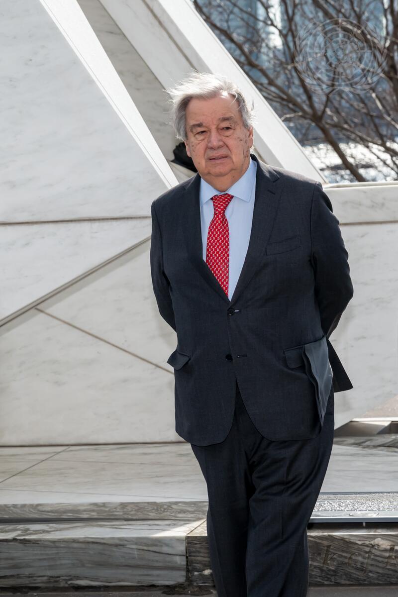 Secretary-General António Guterres poses for a photo by the Ark of Return on the International Day of Remembrance of the Victims of Slavery and the Transatlantic Slave Trade (25 March).
