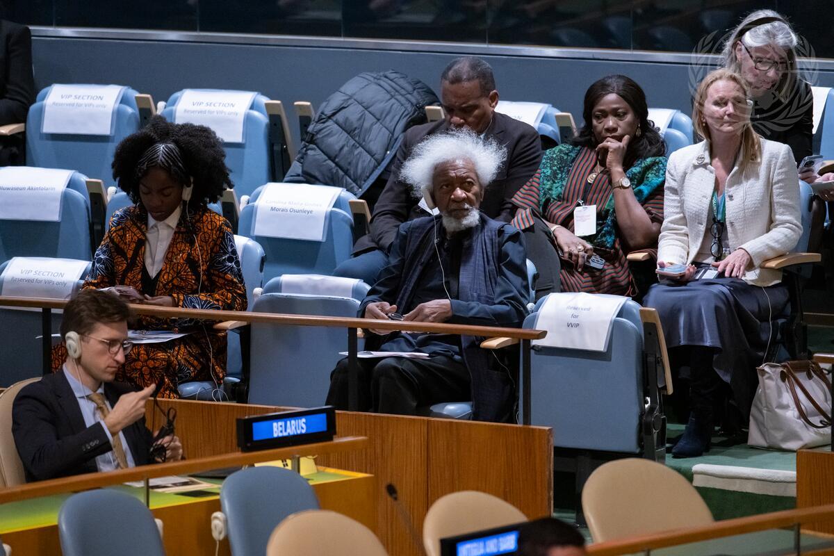 Wole Soyinka, playwright, poet and Nobel Laureate, and Salome Agbaroji, 2023 National Youth Poet Laureate, attend the commemorative meeting of the General Assembly to Mark the International Day of Remembrance of the Victims of Slavery and the Transatlantic Slave Trade.