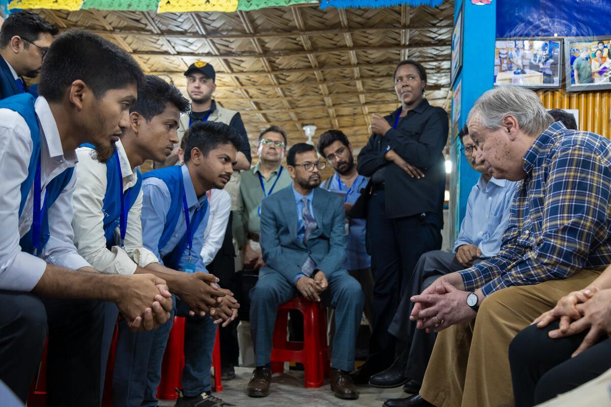 UN Secretary-General António Guterres (right) meets with Rohingya youth at a livelihoods center in a refugee camp in the southern Bangladesh costal district of Cox’s Bazar. Bangladesh is hosting over one million Rohingya refugees who fled violence in neighbouring Myanmar and Cox’s Bazar is home to the world’s largest refugee camp. As drastic aid cuts by major donors threaten food supplies to the camps, Mr. Guterres described Cox’s Bazar as “ground zero” for the impact of funding cuts.