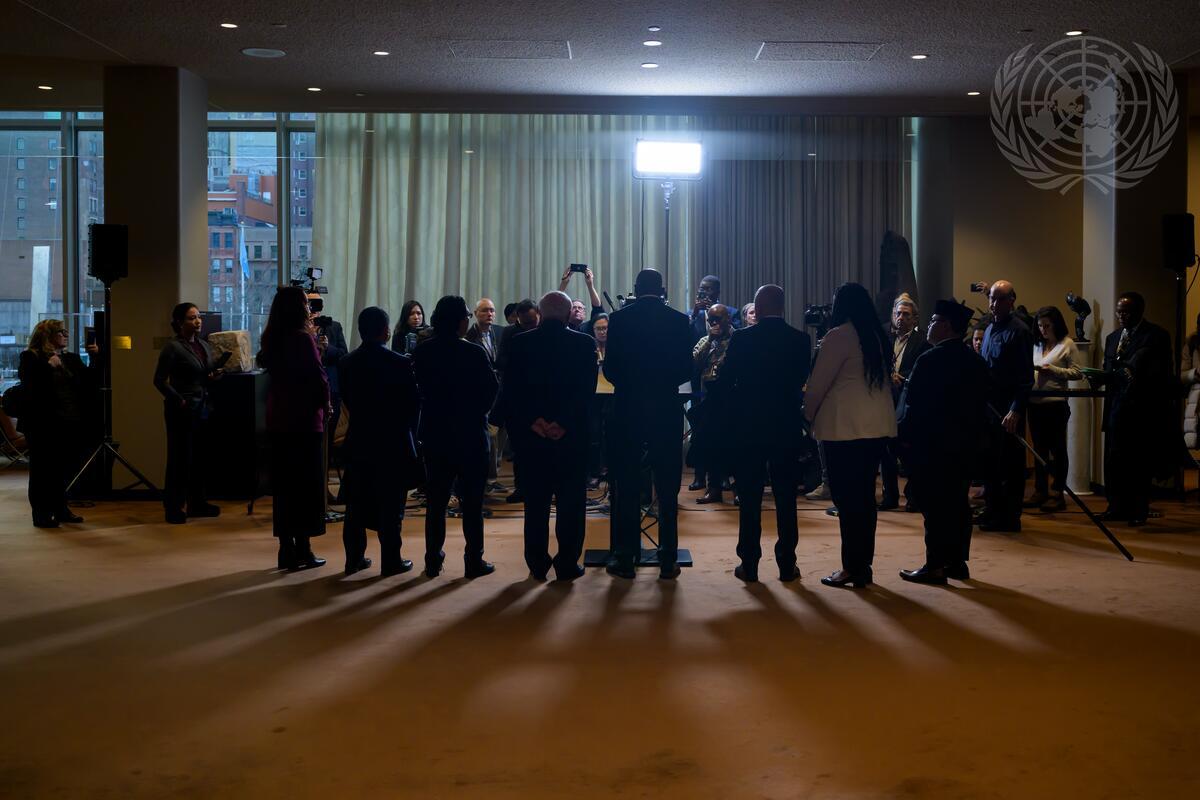Coly Seck (centre), Chair of the Committee on the Exercise of the Inalienable Rights of the Palestinian People and Permanent Representative of the Republic of Senegal to the United Nations, briefs reporters with Members of the newly-elected Committee on the Exercise of the Inalienable Rights of the Palestinian People (CEIRPP Bureau). At fourth from left is Riyad Mansour, Permanent Observer of the State of Palestine to the United Nations.
