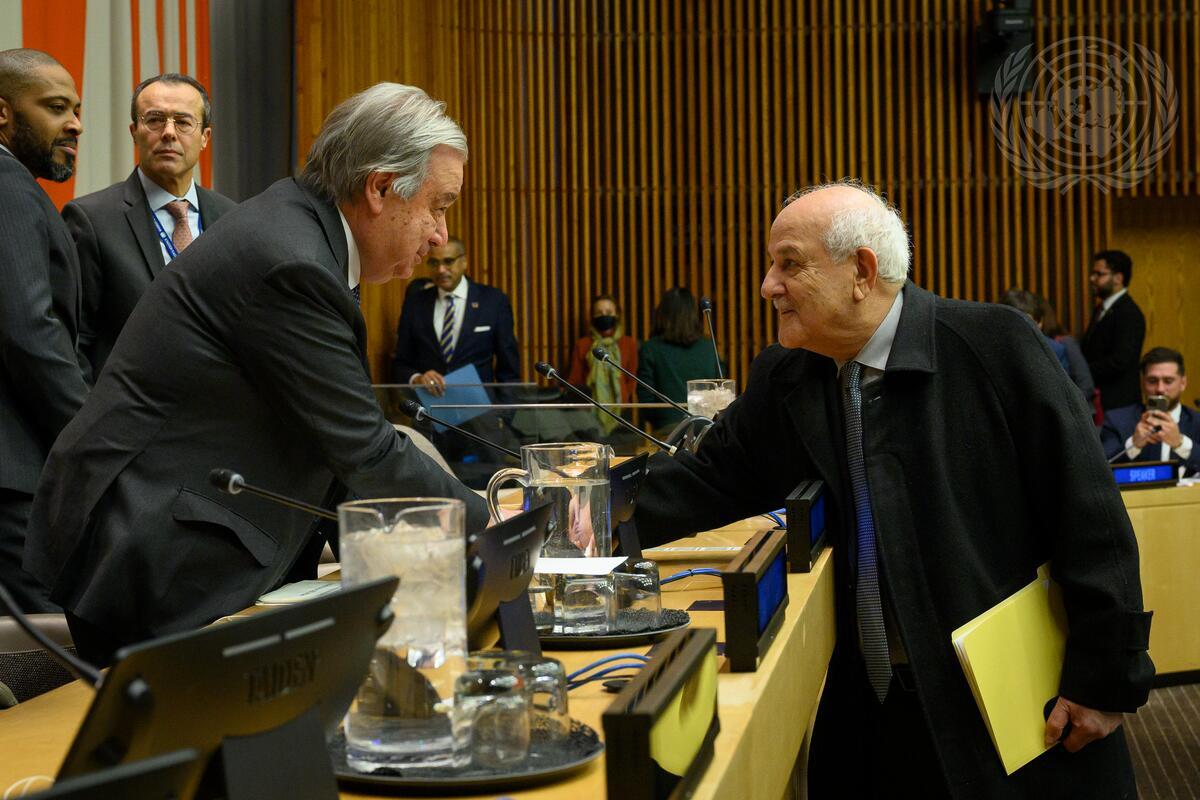 Secretary-General António Guterres (centre left) greets Riyad Mansour, Permanent Observer of the State of Palestine to the United Nations, ahead of the 2025 opening session and the 420th meeting of the Committee on the Exercise of the Inalienable Rights of the Palestinian People.