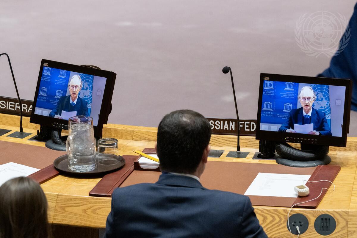 Geir Pedersen (on screens), Special Envoy of the Secretary-General for Syria, briefs the Security Council meeting on the situation in the Middle East (Syria).