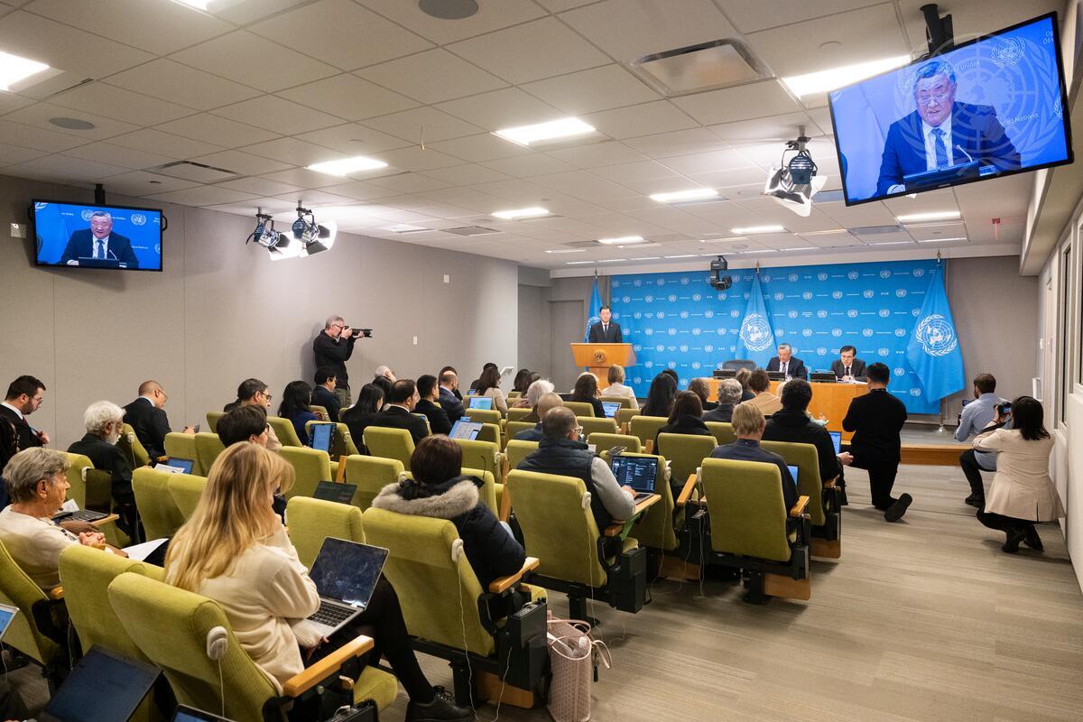 Fu Cong (on screens and at left at dais), Permanent Representative of the People’s Republic of China to the United Nations and President of the Security Council for the month of February, briefs reporters on the programme of work of the Security Council.