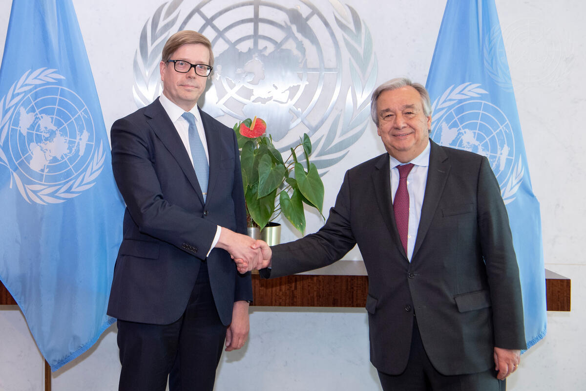 Jukka Salovaara (left), new Permanent Representative of the Repulic of Finland to the United Nations, presents his credentials to Secretary-General António Guterres.