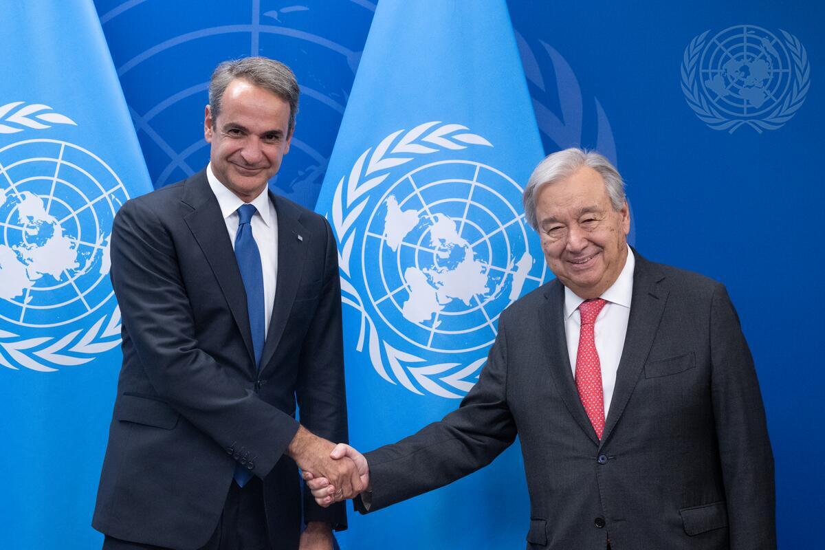 Secretary-General António Guterres (right) meets with Kyriakos Mitsotakis, Prime Minister of the Hellenic Republic,