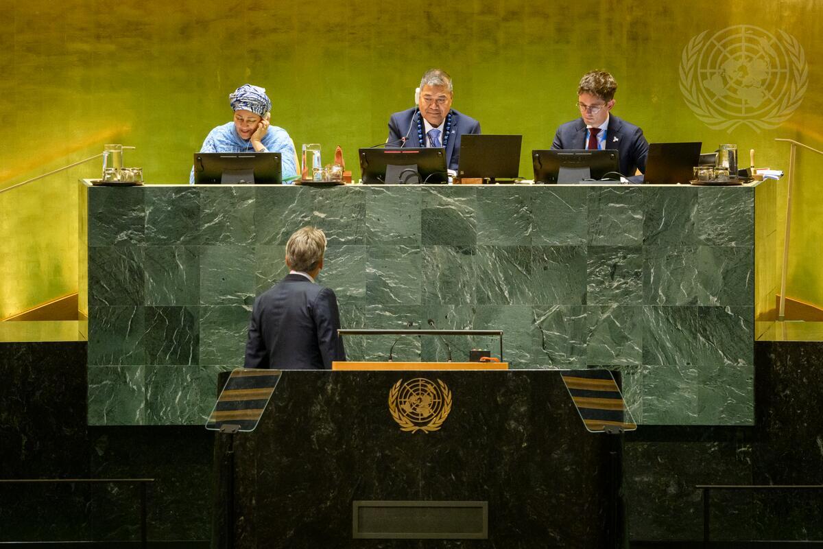 Hendrikus Wilhelmus Maria Schoof (standing at podium), Prime Minister of the Kingdom of the Netherlands, greets Jeem Lippwe, Vice-President of the seventy-ninth session of the United Nations General Assembly and Permanent Representative of the Federated States of Micronesia to the United Nations, ahead of addressing the general debate of the General Assembly’s seventy-ninth session. At left at dais is Deputy Secretary-General Amina Mohammed.