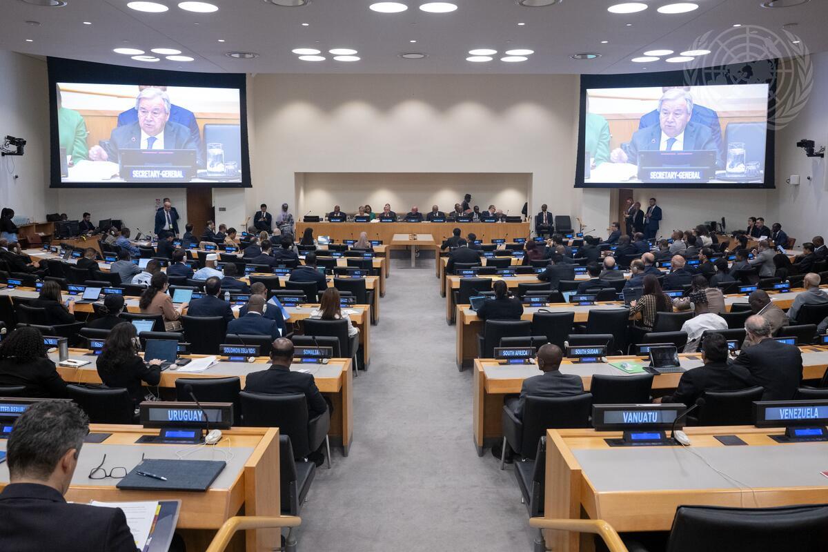 Secretary-General António Guterres (on screens and on dais) addresses the opening session of the forty-eighth annual meeting of Ministers for Foreign Affairs of the Group of 77.