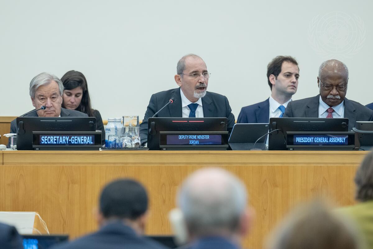 Ayman Safadi (centre), Deputy Prime Minister and Minister for Foreign Affairs and Expatriates of the Hashemite Kingdom of Jordan, speaks during the high-level ministerial meeting in support of the United Nations Relief and Works Agency for Palestine Refugees in the Near East (UNRWA). At left is Secretary-General António Guterres an at right is Philemon Yang, President of the seventy-ninth session of the United Nations General Assembly.
